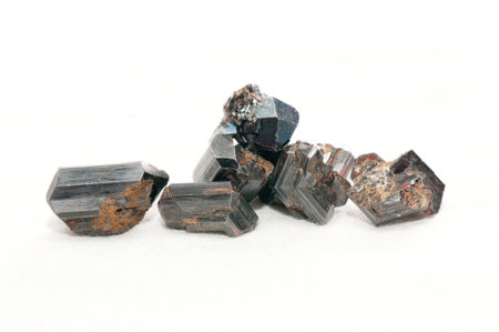macro mineral stone sherle, schorl, black tourmaline on white background close-up