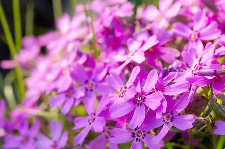 Shallow depth of field photo, only few flowers in focus, pink phlox blossoms lit by sun. Abstract spring flowery garden background, space for text in upper part.