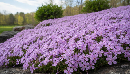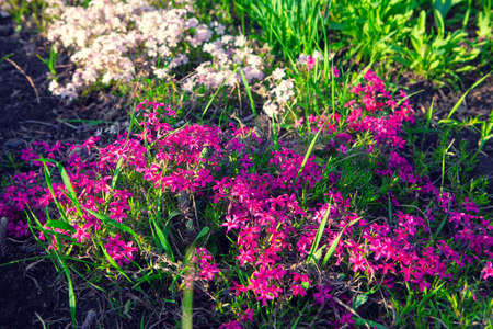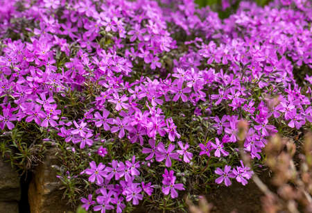 Purple creeping phlox, on the flowerbed. The ground cover is used in landscaping when creating alpine slides and rockeries.