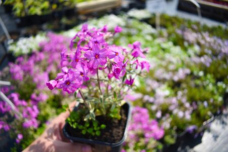 Tufted phlox (Phlox douglasii) 'Crackerjack' blooms in the plant nursery in early June. high quality photo