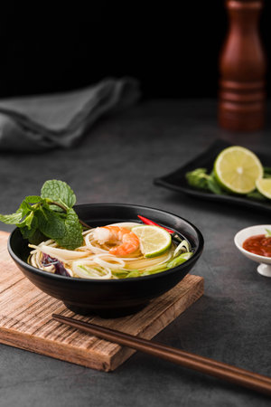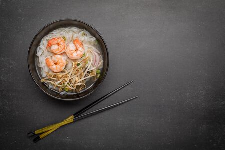 Vietnamese Pho tom noodle broth asian soup prawn. Top view with copy space