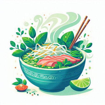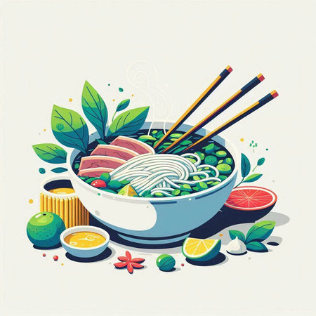 Illustration of a bowl of Asian soup with chopsticks and lime