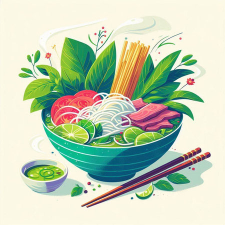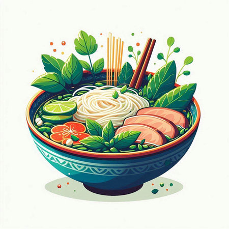 Illustration of noodle soup in bowl with chopsticks and vegetables