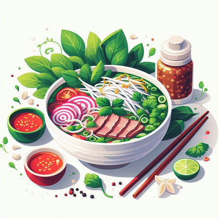 Vietnamese noodle soup with pork and vegetables. Vector illustration.