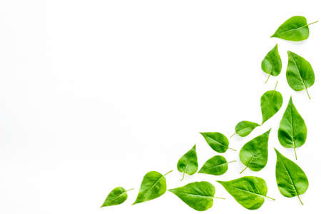Green leaves on white background. Flat lay, top view. Nature concept.