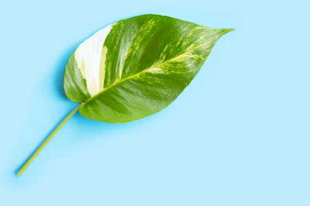 Golden pothos or devil's ivy leaf on blue background. Copy space