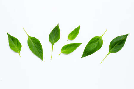Green leaves of chili peppers on white background.