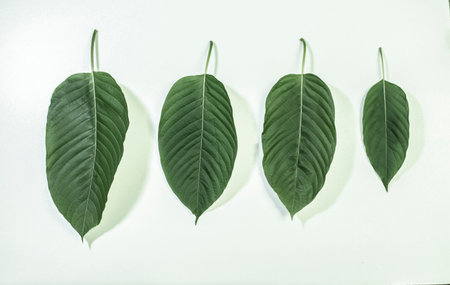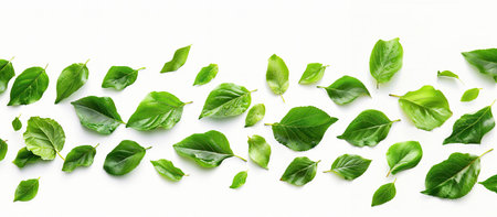 Close-up of vibrant green leaves arranged on white background, creating a minimal and refreshing botanical flat lay for health and nature themes