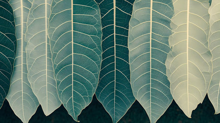 Close-up view of several green leaves with detailed venation, exhibiting a textured, natural pattern. Suitable for nature, botanical, or design projects.