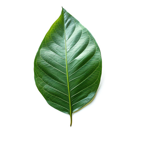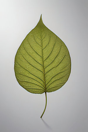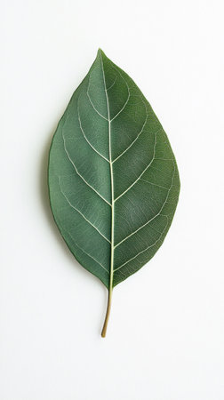Close-Up of a Fresh Green Leaf Showcasing Intricate Veins on a Clean White Background, Ideal for Nature and Environmental Themes