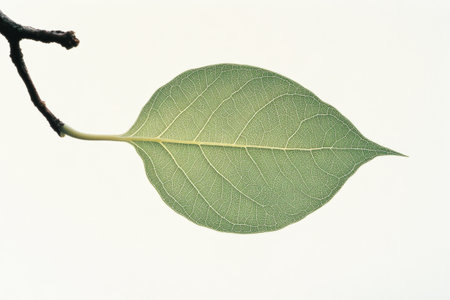 Green leaf attached to a slender branch exhibits intricate vein patterns and a smooth surface. The background is softly muted, highlighting the leaf's features.
