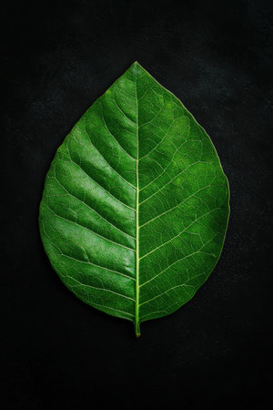 Vibrant green leaf with detailed veins on black background.
