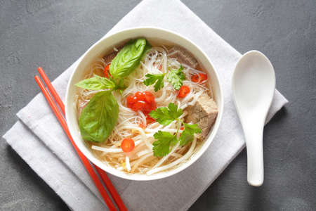 Vietnamese noodle soup with beef and vegetables in bowl on dark background