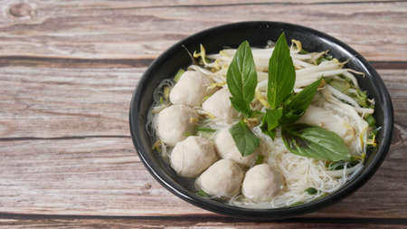 White noodle soup with pork ball and bean sprouts, basil leaves on wooden background, copy space on left.