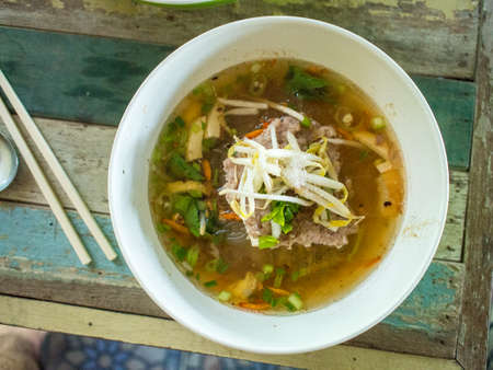 Close up of Pho noodle soup in restaurant in Luang Prabang, Laos. Pho is traditional Vietnamese noodle soup, now is popular food widespread around the world.