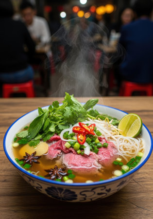 A steaming bowl of Pho, a traditional Vietnamese noodle soup, is presented with fresh herbs, beef, and vibrant garnishes on a wooden table, with a blurred background of people.