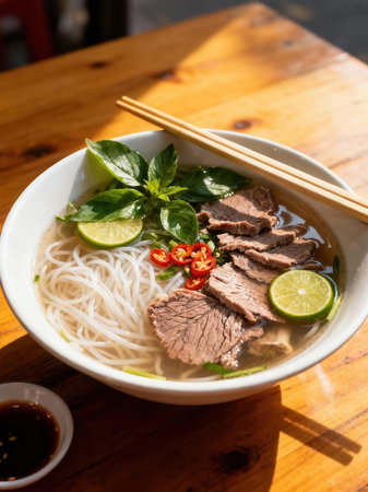 Appetizing bowl of Vietnamese Pho with beef, herbs, and spices served with condiments on a wooden table, perfect for food and restaurant concepts
