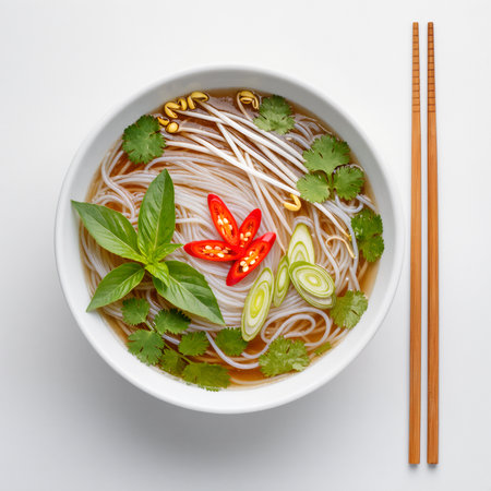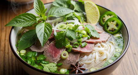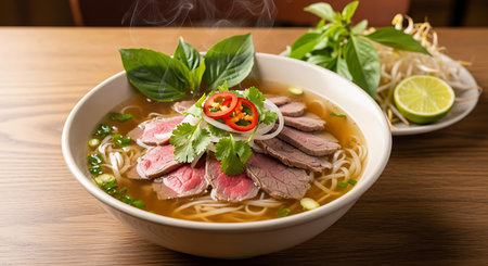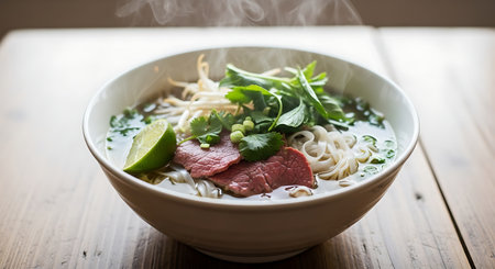 Steaming bowl of pho with fresh herbs showcases Vietnamese culinary delight