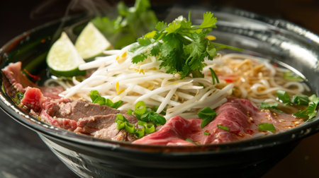 A vibrant bowl of Vietnamese pho featuring tender beef, fresh herbs, and lime slices in a rich broth. Ideal for showcasing culinary delights.