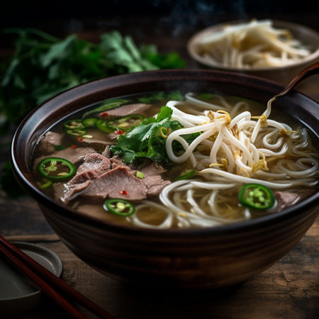An AI-generated illustration of a steaming bowl of pho served with fresh vegetables.