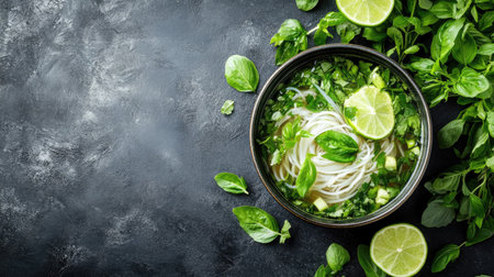 Top view of a bowl of Vietnamese pho ga with fresh herbs and lime. Copy space provided.