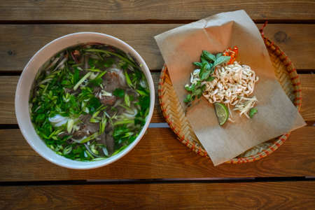 Pho Bo, Vietnamese Fresh Rice Noodle Soup with Beef, Herbs, and Chili. Vietnam National Dish.
