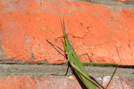 Green locusts, orthoptera insect. Ordinary locusts on a brick wall.