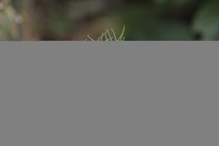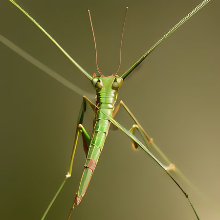 Detailed macro photo of a green grasshopper with long antennae and spiny legs