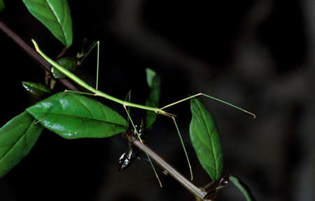 Green stick insect, master of disguise sits on a brown branch on a black background