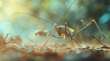 Macro of daddy long legs Phalangida backlighted over green forest background