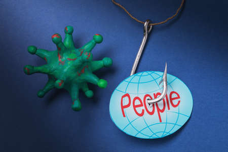 Toy bacteria, tag with text and a large hook. Concept on the topic: humanity is held hostage by the coronavirus