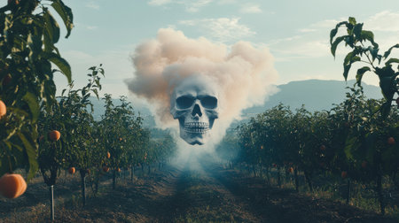 Surreal digital art of a skull engulfed in a pale cloud, floating above a lush orchard under a hazy sky. Pixelated skull detail contrasts with the realistic orchard setting. Eerie yet serene atmosphere.
