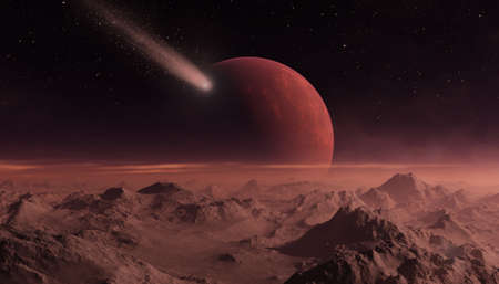 3d rendered Space Art: Alien Planet - A Fantasy Landscape with red skies and stars