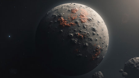 planet surface in space with dark asteroids