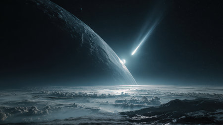 A comet racing past Earth moon, its glowing tail illuminating the lunar surface in stunning movie-like clarity