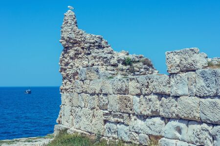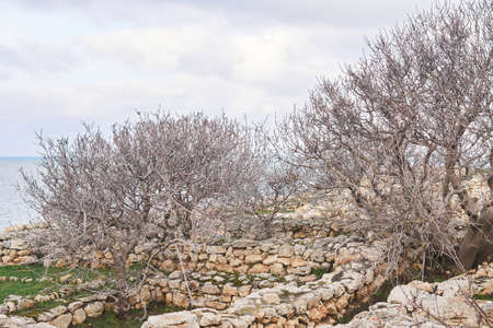 ruins of antique ancient Greek city of Chersonesos on the seashore, overgrown with trees