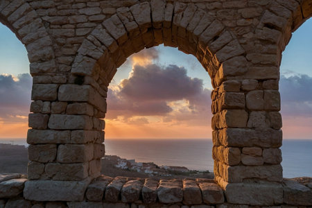 Sunset view of the ruins of an ancient fortress on the island of Rhodes, Greece
