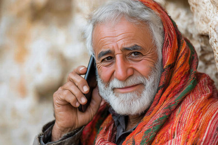 An elderly man in national oriental clothing is calling on a mobile phone. He looks at the camera and smiles.