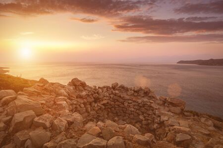Twilight on the island of Crete near Spinalonga with a foggy horizon, sea coast, rocks and stones on a summer morning.