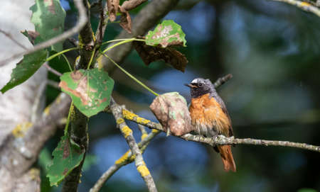 Common Redstart (Phoenicurus phoenicurus). Beautiful bird perched on branch of tree in the forest. Wildlife in nature. Netherlands.
