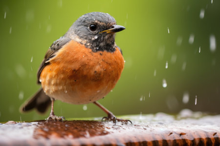 A close-up of a plump brown bird perched on a wooden post in the rain, showcasing its vibrant orange breast.