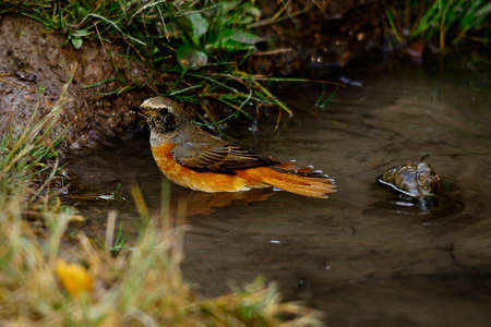 Male of Common Redstart (Phoenicurus phoenicurus) on the floor. Red and orange bird with blach face and grey mantle