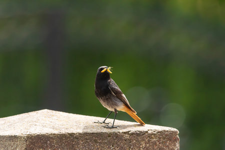 The black redstart, Phoenicurus ochruros bird in a city garden, summer day, eastern Poland