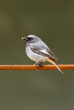 Black redstart female bird with insect for chicks (Phoenicurus ochruros)
