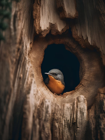 the american redstart, a vibrant warbler, is reimagined as a lifelike 3d character with comically bulging eyes, blending hyper-realistic sci-fi elements with the subtle emotional expressions reminiscent of the barbizon school, while incorporating felt creations and overexposure to add tactile texture and profound depth to this whimsical avian portrait. ai generated