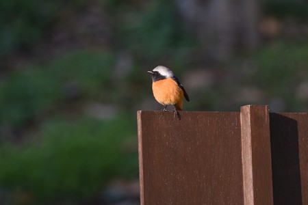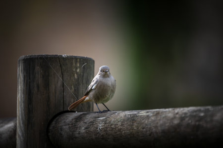 A selective focus of a common redstart bird perching on a wooden surface against a blurred background