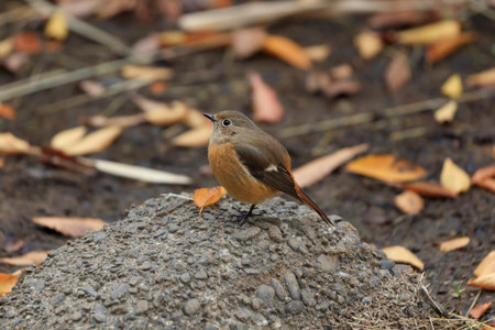 A female Daurian Redstart looks up at the sky from a platform among fallen leaves