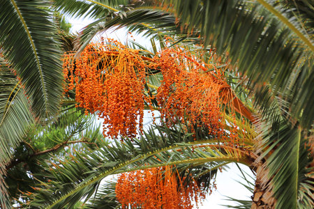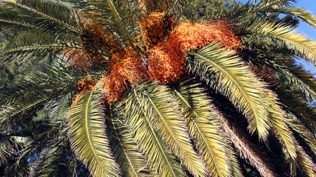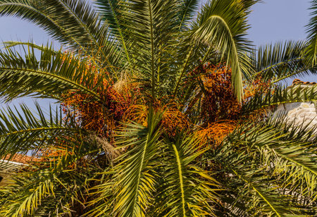 Protaras. Famagusta area. Cyprus. Date palm with ripe orange dates on the street of Protaras against the blue sky.