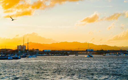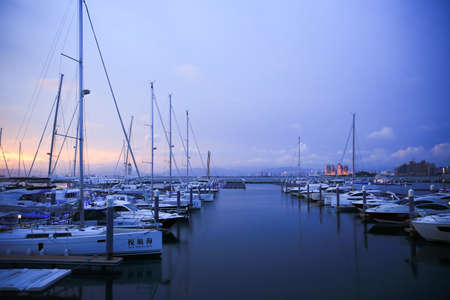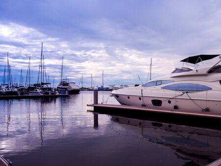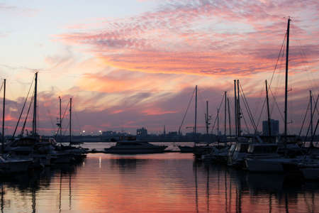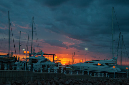 Yacht port and beautiful sunset over Varna, Bulgaria. Sailboat harbor, many beautiful moored sail yachts in the sea.
