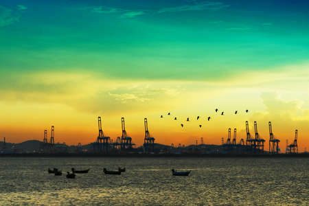 birds flying over cranes on seaport and sunset colorful sky and fishing boats are parking on sea